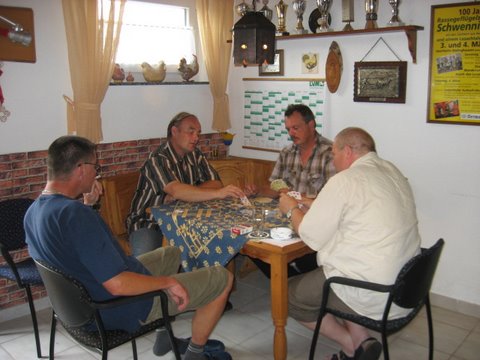 Trotz Ferienzeit und weiteren Großveranstaltungen in der Umgebung meldeten sich 14 Skatbrüder beim ersten Skatturnier des RGZV Schwenningdorf am letzten Freitag an. Nach Zuteilung der Spielpartner wurden 2 Runden gespielt. Interessierte Besucher verfolgten die spannenden Spiele an den Tischen. ... mehr! Bilder!