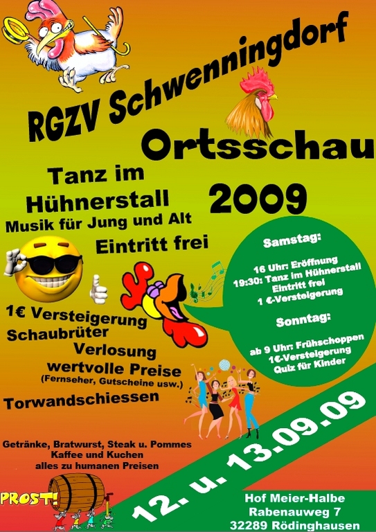 Am 12. und 13 September veranstaltet der Rassegeflügelzuchtverein Schwenningdorf seine Ortsschau auf dem Hofe Meier, Rabenauweg 7 in Schwenningdorf. An beiden Tagen finden attraktive Aktionen für jung und alt statt. 17 Züchter stellen 180 Tiere (Gänse, Hühner, Zwerghühner und Tauben) aus, darunter auch Rassen die vom Aussterben bedroht sind. Es wird ein Schaubrüter aufgebaut, wo man Live dabei sein kann, wie die Küken aus dem Ei schlüpfen. Der Imker-Verein baut einen Stand auf. Die Kleinen können ihr Geschick beim Torwandschiessen unter Beweis stellen. 300 attraktive Preise sind zugewinnen. ... mehr!